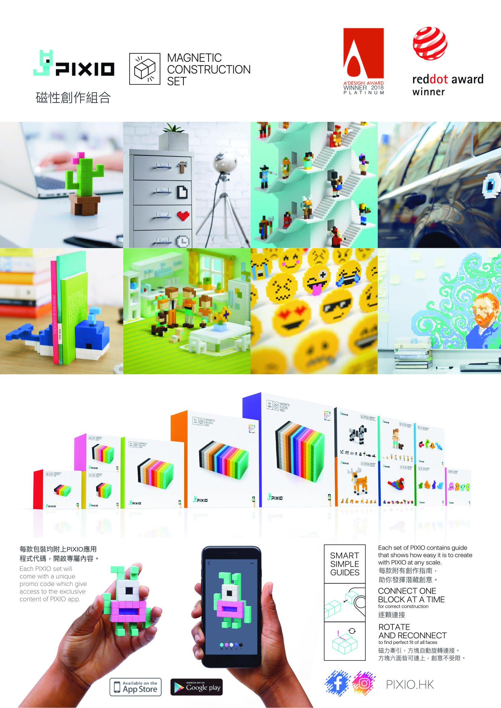 PIXIO 獨特設計,每顆 8mm x 8mm x 8mm 方塊均內含6 顆磁石。磁力牽引,方塊⾃自動旋轉連接。方塊六⾯面㫮可連上,可以不受限制自由創作。 因著磁力幫助更可以在不同金屬表面連繫。備有多款顏色,實現你心目中的完美作品。